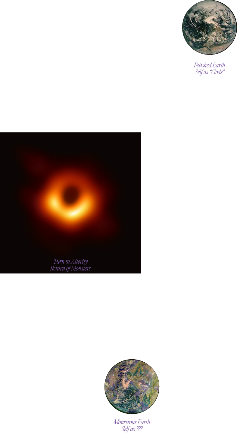 Monstrosity, here, becomes a productive alterity that resists knowing, an opacity that unsettles the smooth encapsulation of “wholeness.” In this turn outward, the blackhole becomes a counter-image to Whole Earth. Unlike the mirror of Whole Earth, the blackhole presents an indifferent void in which humanity cannot be reflected. This productive alienation and disorientation catalysed by the black hole image becomes a necessary movement in destabilizing the geocentric intuition.